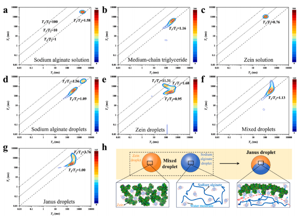 通过低场核磁共振(LF-NMR)技术(图6),从分子层面揭示了Janus液滴形成过程中水分子的动态迁移机制。研究发现在二维T₁-T₂关联谱中,玉米醇溶蛋白液滴谱图出现特征信号(T₁/T₂=1.68),表明其作为两亲性分子能够有效定位在油水界面并介导质子交换;相比之下,海藻酸钠液滴由于界面性能较差,仅显示油水两相的分离信号。在Janus液滴形成后,谱图在T₁/T₂=3.76处出现新的特征峰,同时T₂弛豫时间从混合液滴的343.1ms显著降低至307.7ms,这些变化明确证实了玉米醇溶蛋白与海藻酸钠相之间发生了显著的水分子扩散与交换过程。该发现为捕食-被捕食相互作用驱动Janus液滴形成的机制提供了直接的分子证据。